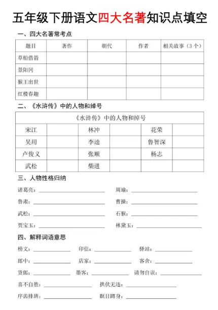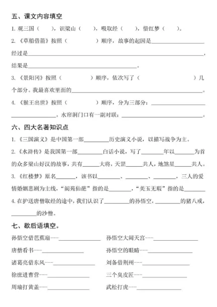 五年级(下)语文 四大名著知识点填空,PDF电子版,可打印,免费下载