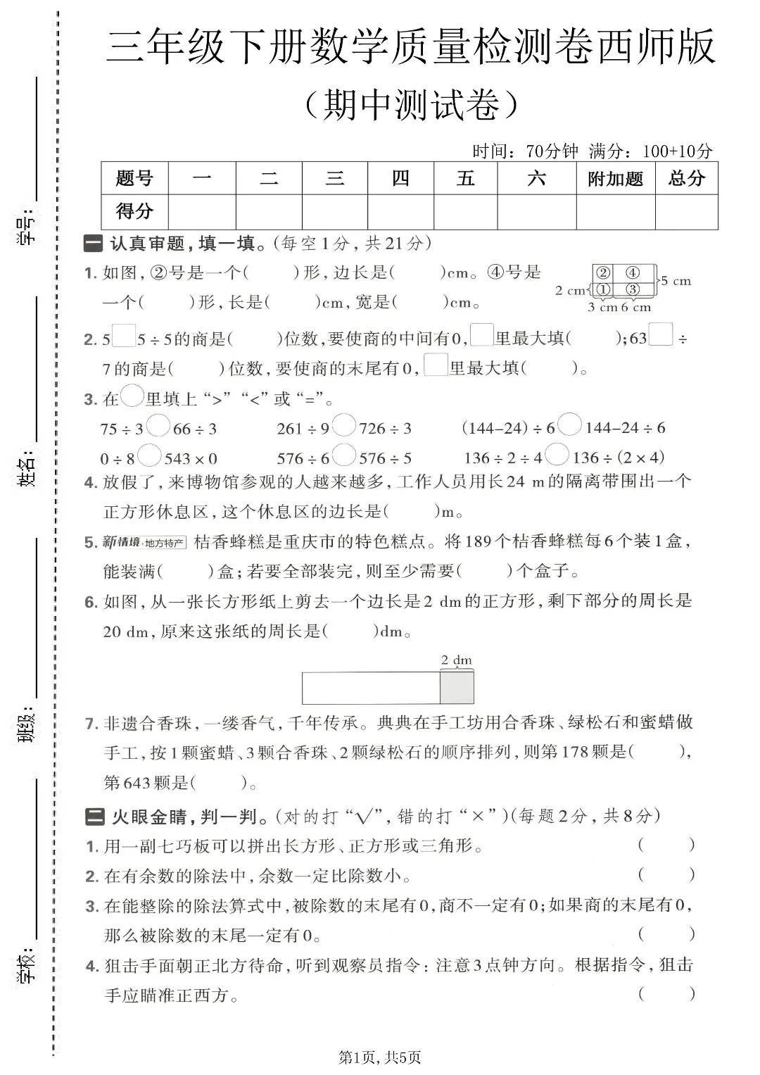 26年春新三年级下册西师版数学《期中拔尖考试测试卷》2套附答案‖高清可打印