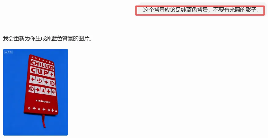 然后第1次生成的图片,有一个问题就是在于它的背景的颜色其实会有一些不均匀和阴影的地方,然后可以进一步进一步的下指令让修改:
