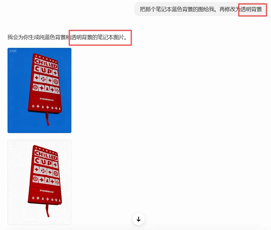 考虑到透明背景的图是非常方便我们来进行编辑的,这里我突发奇想它是否能够生成透明背景的图,然后给AI重新下达了指令: