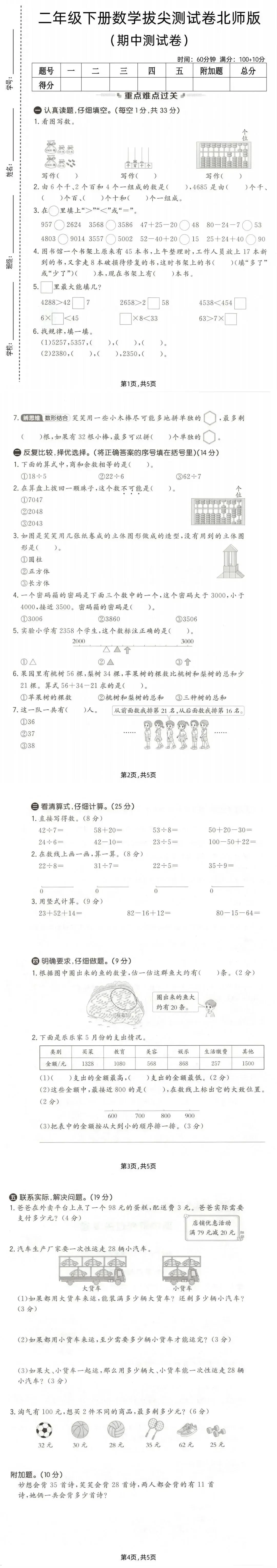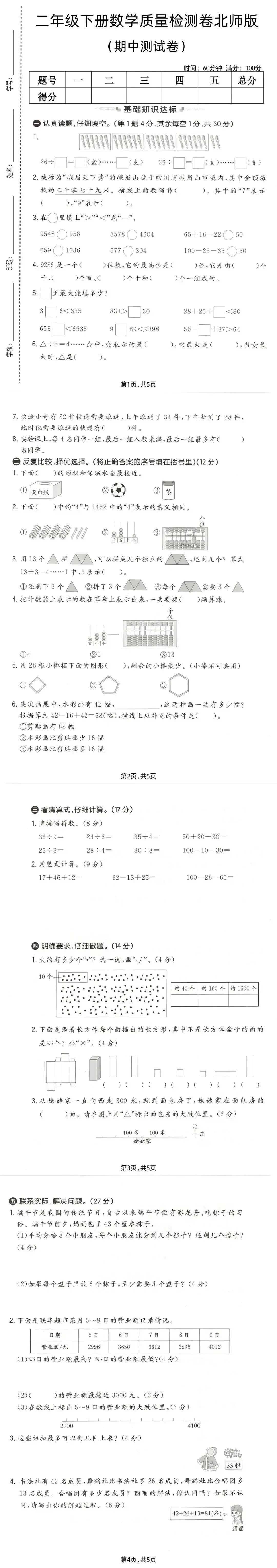 26春二年级下册数学北师大版《期中真题测试卷》(共5套,含答案,可下载打印)