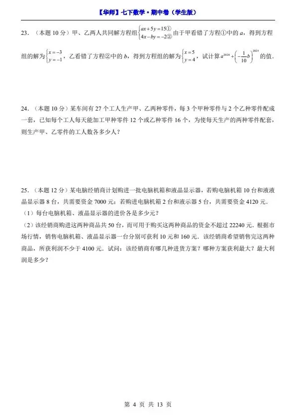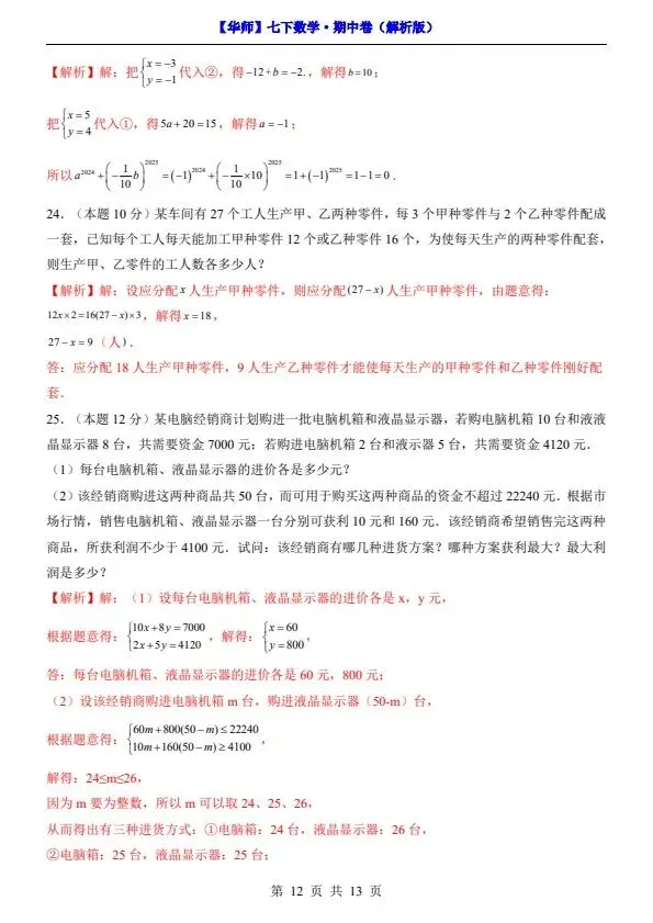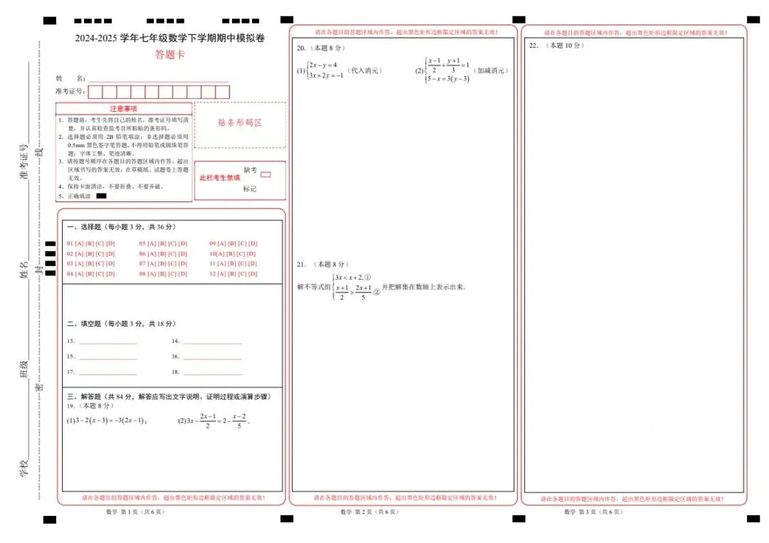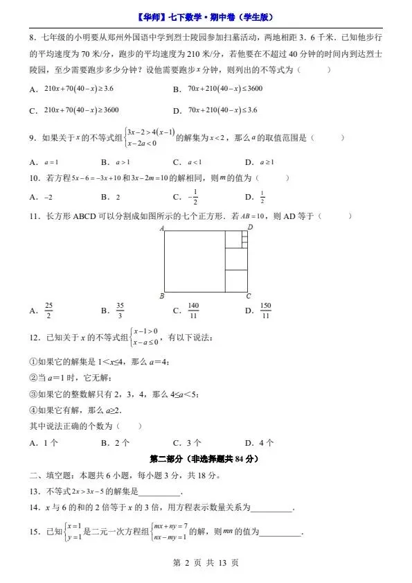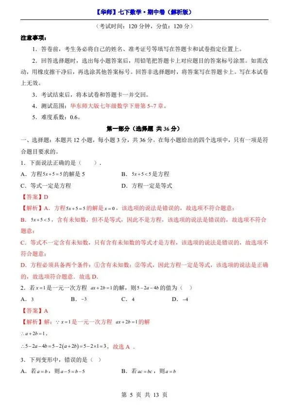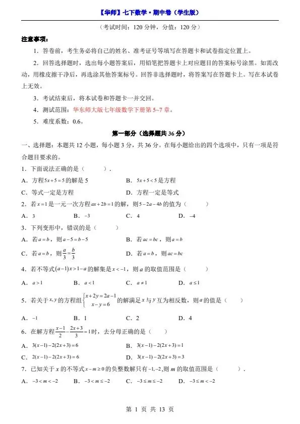 新七年级下册数学华师版期中试卷(答案+答题卡)完整电子版可打印!家长关注收藏,让孩子用高效的方法学透知识点,用优质的资源为学习赋能,在成长的赛道上稳步前行,轻松提分!
