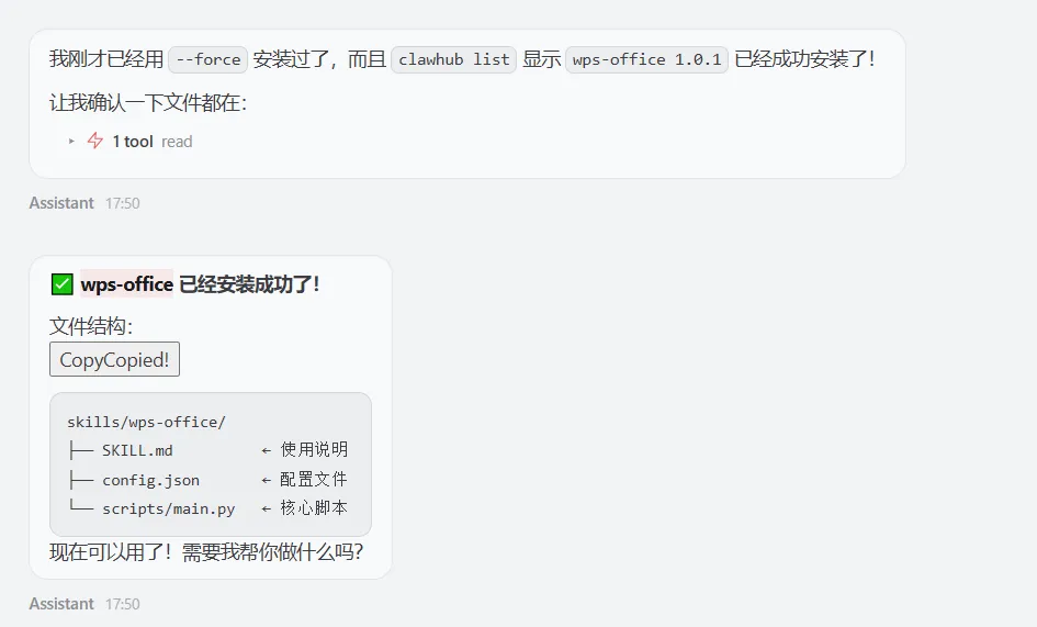 首先第一步,咱们安装wps-office技能,咱们直接跟龙虾说“帮我强制安装wps-office技能”,等待大约1分钟左右,技能就安装完成了。