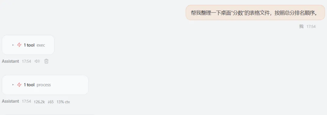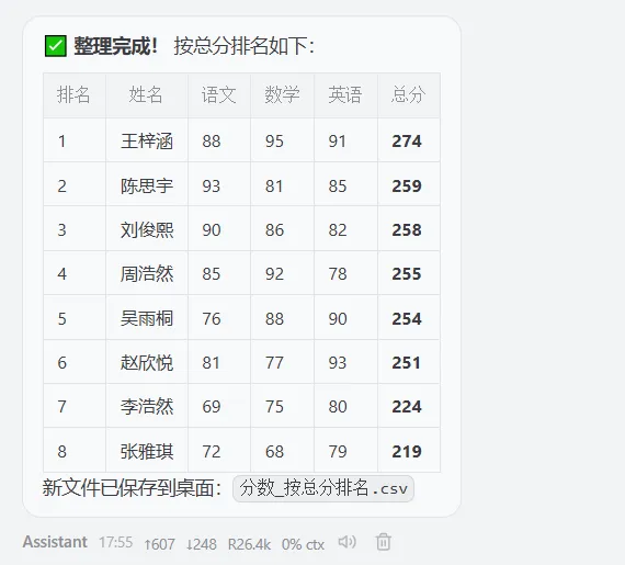 我跟龙虾说“帮我整理一下桌面“分数”的表格文件,按照总分排名顺序。”大约等待了一分钟左右的时间,当然表格越大,时间可能会越久,我这仅仅只是测试。