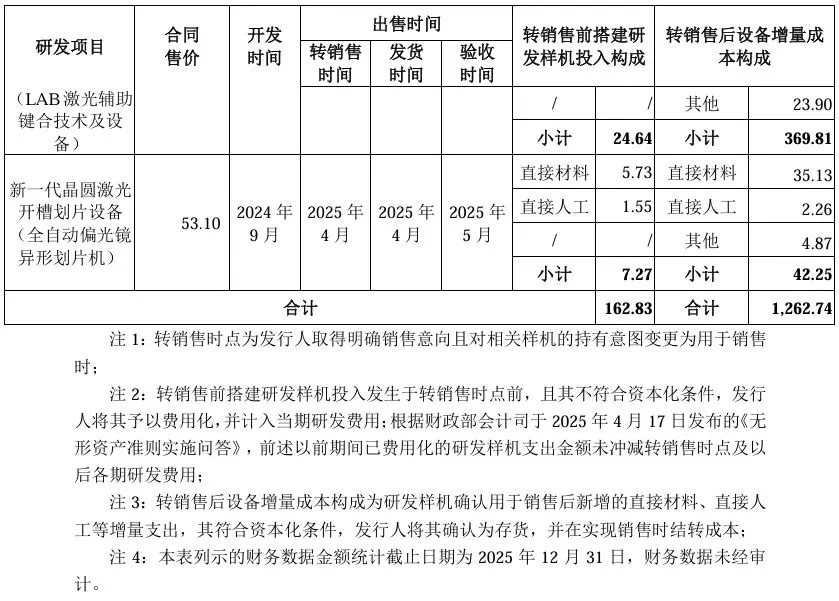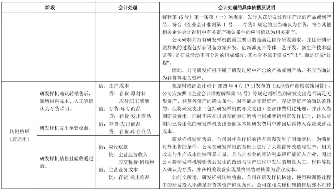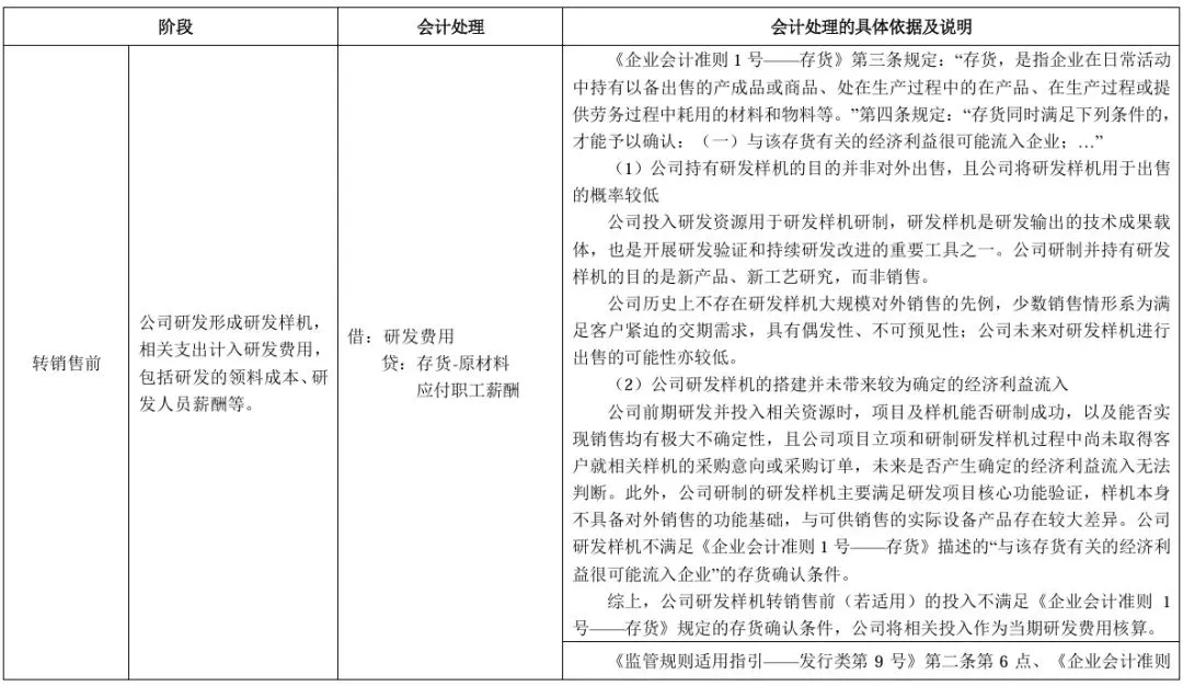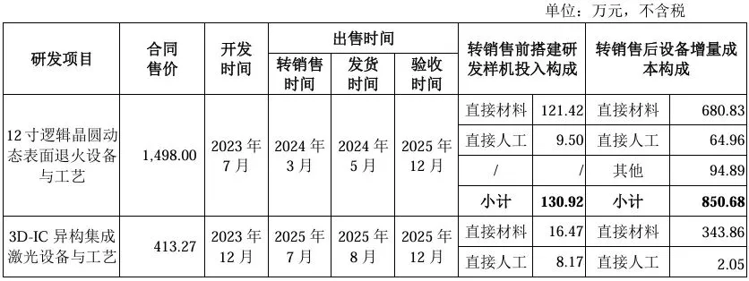 (3)发行人 12 寸逻辑晶圆动态表面退火设备与工艺研发样机、全自动偏光镜异形划片样机存在大额销售情况,研发样机形成时点未确认为存货,销售时点亦未冲减研发费用。