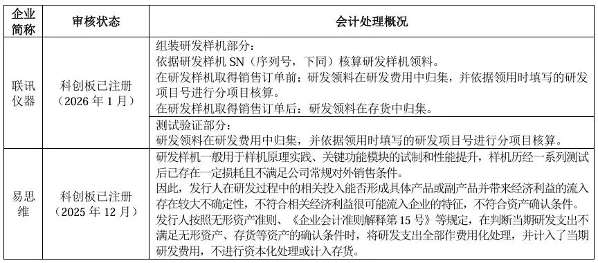 联讯仪器、易思维等企业基于与发行人相似的业务逻辑,对研发样机相关投入作为研发费用核算而未确认存货,具体情况如下表所示: