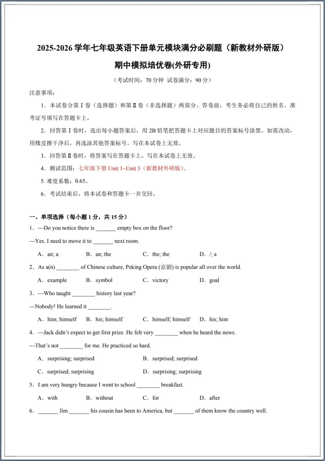 新版|2026春新外研版七年级下册【英语】期中测试卷.模拟培优卷,附含答案解析.有可打印!