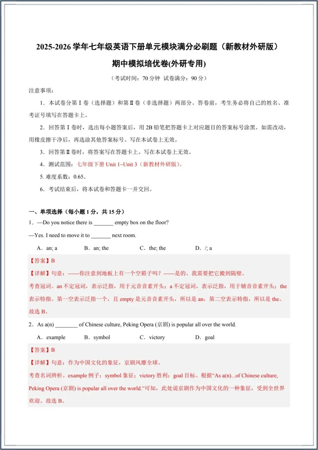 今日分享:2026春新外研版下册(英语)七年级英语期中模拟培优卷(外研专用)附含答案解析。有电子版可下载打印!