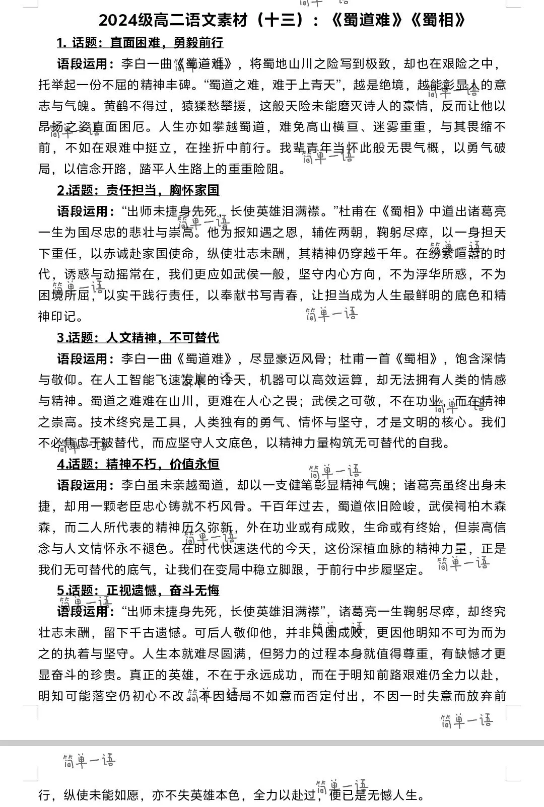 纯手工整理:可直接打印背诵的《蜀道难》《蜀相》课内素材议论文语段.