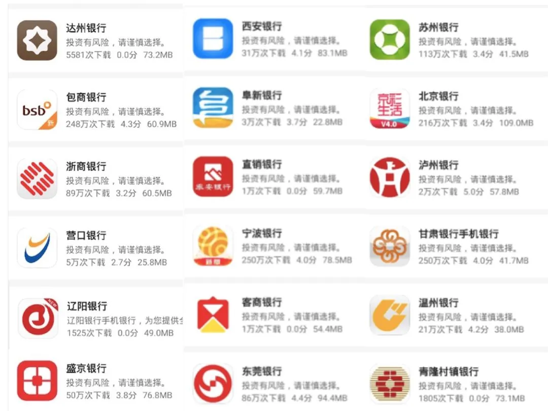 应用宝数据显示,大部分中小银行的APP下载量在数百万左右,比如包商银行248万次、宁波银行250万次。