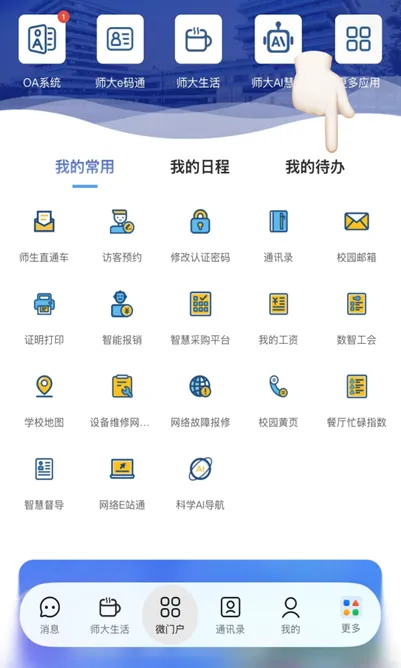 该栏目聚焦师生日常高频服务需求,将“修改认证密码”“访客预约”“师生直通车”等常用功能入口集中整合,直接呈现在微门户首页,有效避免用户在多级菜单中反复查找,显著缩短操作路径,提升办事效率。同时,栏目支持个性化定制,师生可根据个人使用习惯,自主添加、删除或调整“我的常用”应用的排序,让服务入口更贴合个人使用场景,实现便捷访问。
