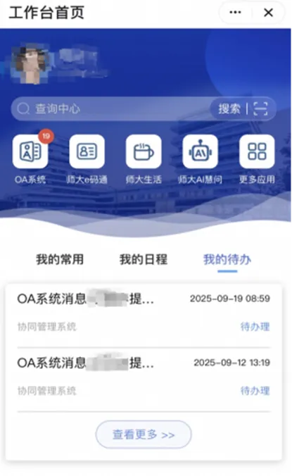 为解决师生 “错过待办”“不清楚进度” 的问题,【我的待办】栏目与学校网上办事大厅及相关业务系统深度打通,实现信息实时同步。无论是教师需要处理的公文审批、申请事项审批,还是学生待办的流程申请、事务办理,相关事项及最新办理进展都会第一时间推送至 APP 首页。师生无需频繁登录原先办理的系统查询,在 APP 上就能直观看到待办状态,及时跟进处理,有效避免信息延迟、事项遗漏,大幅提升校园事务处理效率。