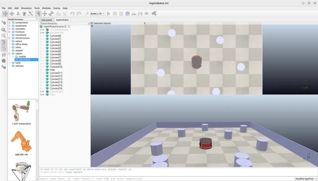 coppeliaSim内置了许多完善的仿真demo,可以在“File -> Open scene”中找到提供的样例。