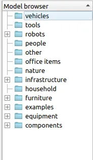 打开coppeliaSim仿真软件,旁边的model browser展示了内置的模型资产,下面是具体模型样式的预览。