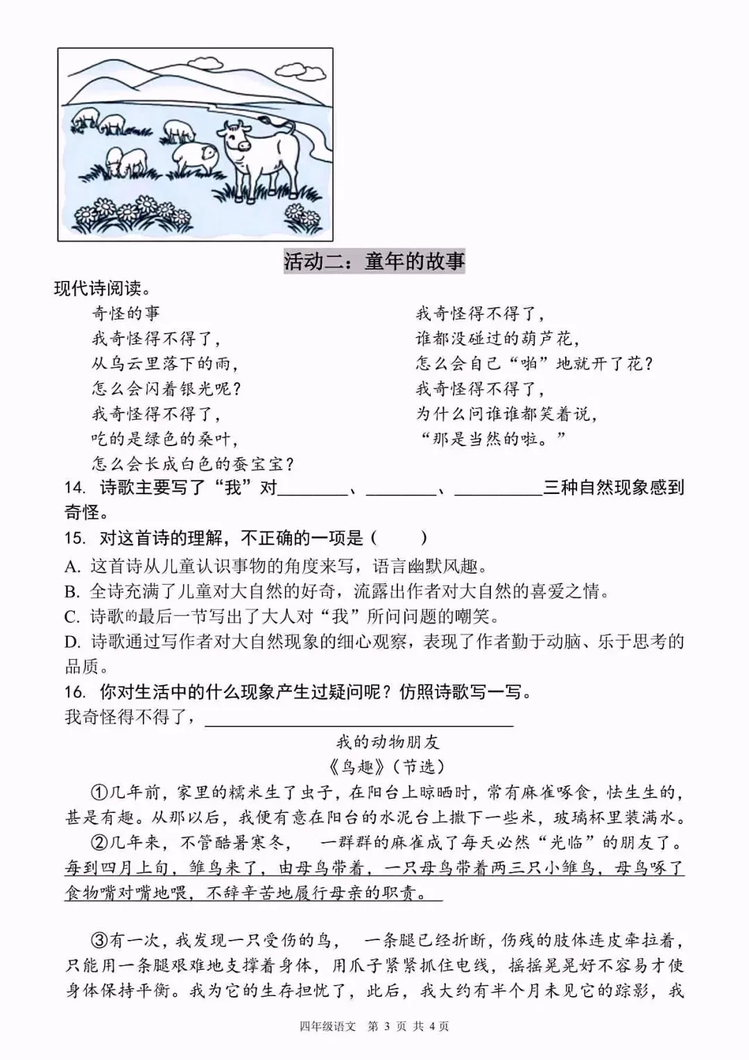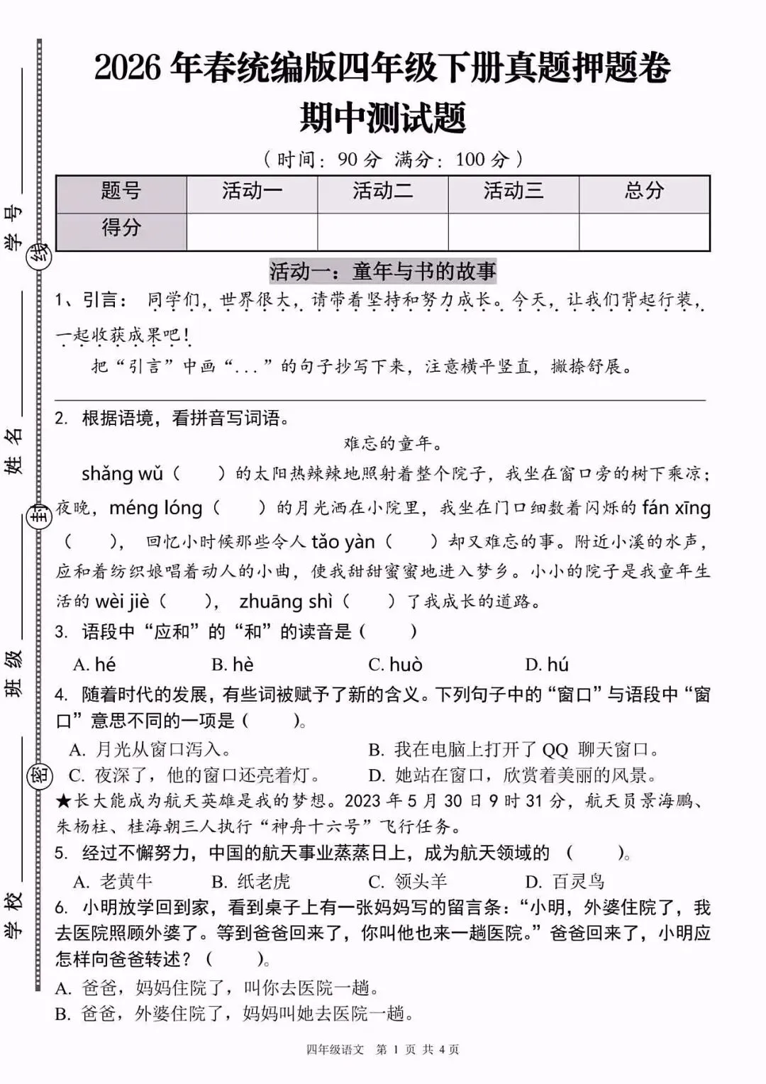 2026春四年级下册语文期中测试卷,高清电子版可打印