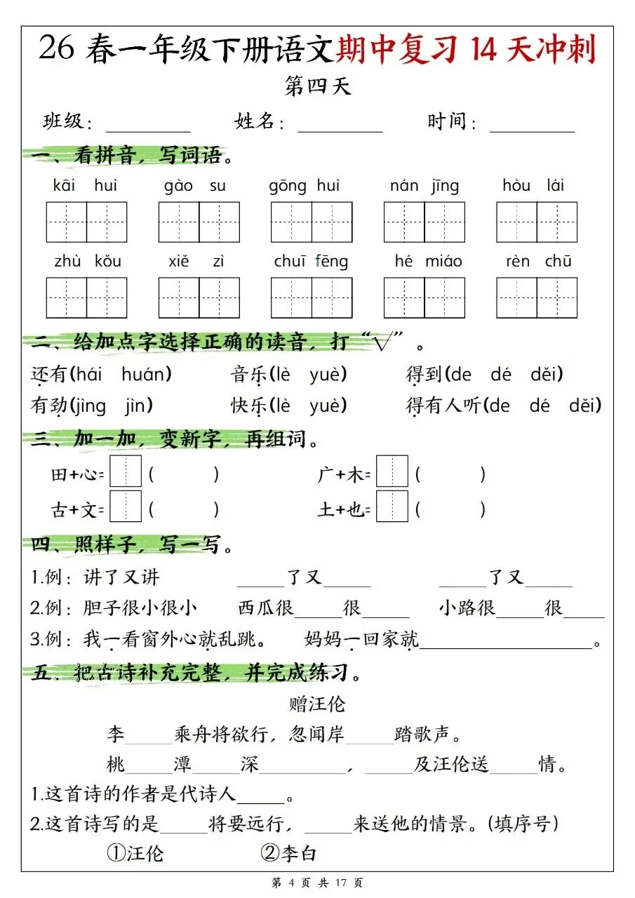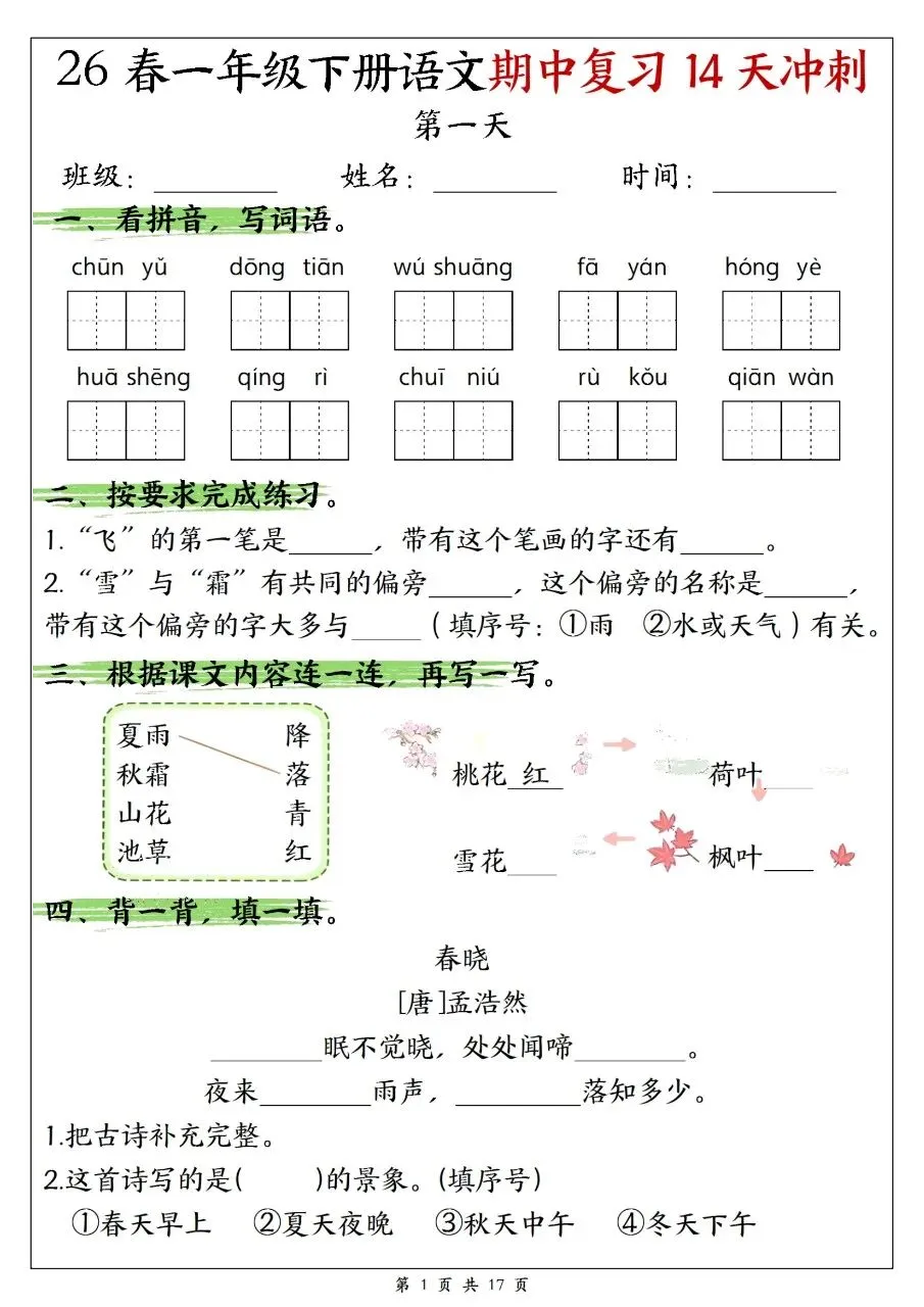 一年级下册语文|期末复习 14 天冲刺(可下载打印)