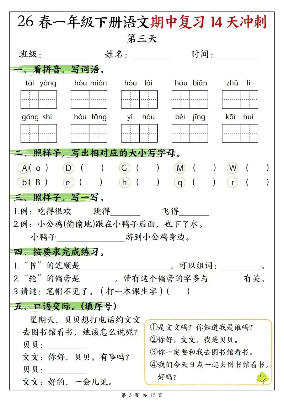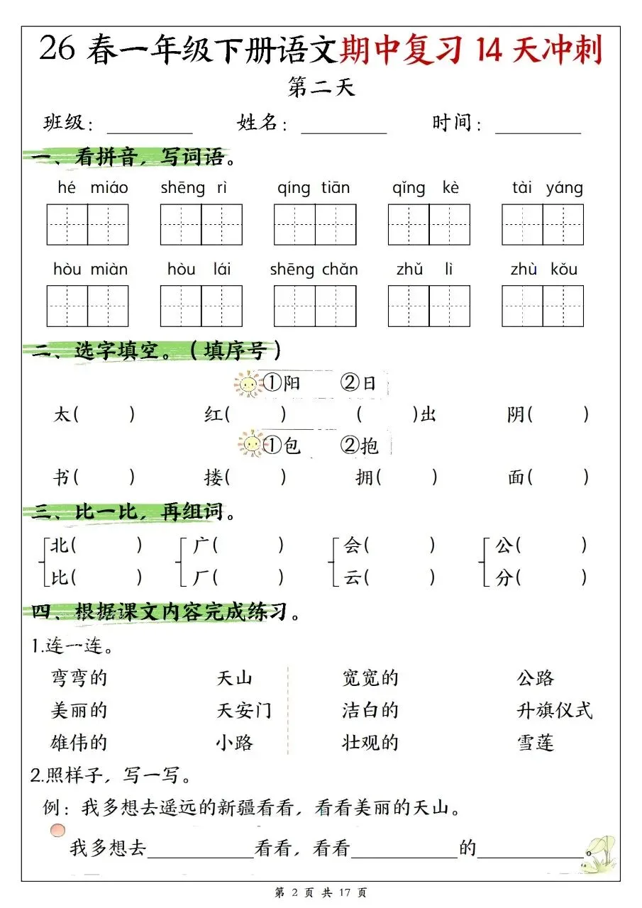 这是2026春一年级下册语文期末14天冲刺复习资料,共14天每日练习,包含看拼音写词语、字音、笔顺、偏旁、组词、仿写、古诗、课文填空、口语交际、查字典等期末必考题型,附完整答案,适合每日打卡巩固基础。