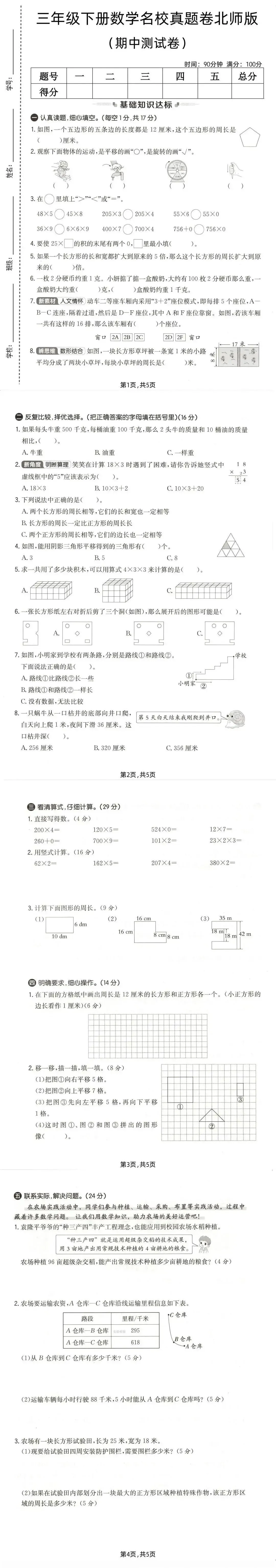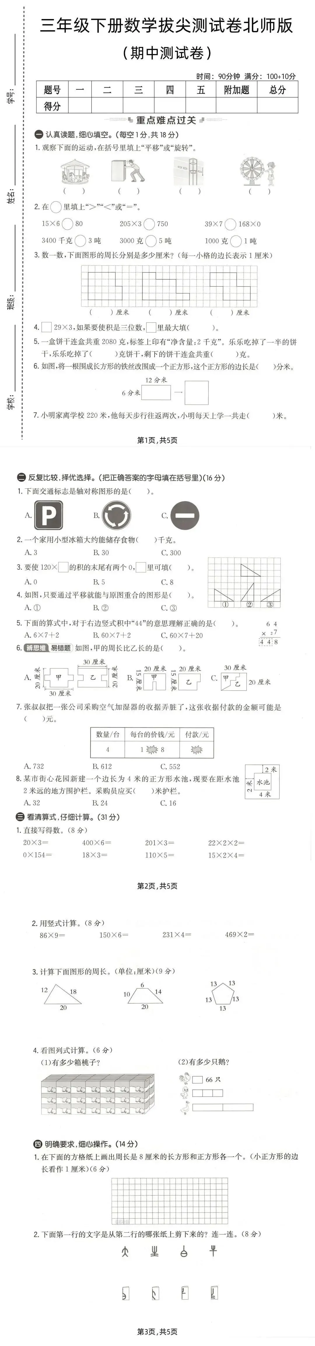 26春三年级下册数学北师大版《期中真题测试卷》(共3套,含答案,可下载打印)