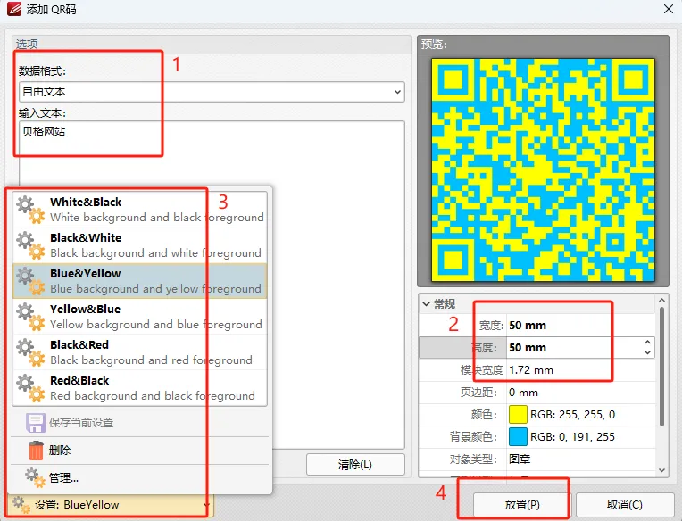 拖拽出方框放置二维码,选择数据格式并输入数据,编辑好二维码格式后点击“放置”,还能在左下角选择二维码颜色,