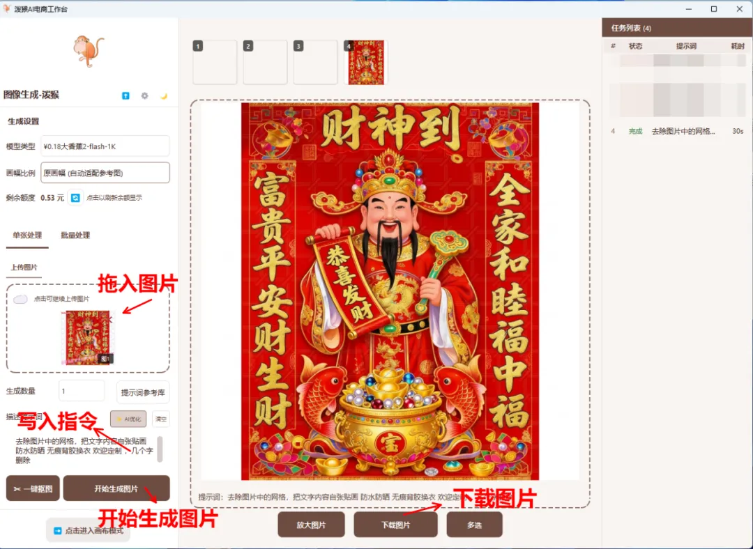 泼猴ai工作台电商软件水印网格去除操作方式 公众号:PS暴走素材 记得设为【星标★】不要错过每一个成长瞬间 当客户发送一张这样的图片给你,让你去掉水印,去掉网格是不是看着都头大,直接GG完全不知道应该怎么做,百度一下相似图搜索?素材网上疯狂搜索? 客户提供的图: 我们去掉水印网格的效果图: 是不是感觉不可思议,很多人肯定问我是怎么做到的!接下来推荐一个工具(泼猴ai工作台),使用就是给指令然后直接出图! 操作方式如下 已关注 关注 重播 分享 赞 视频详情