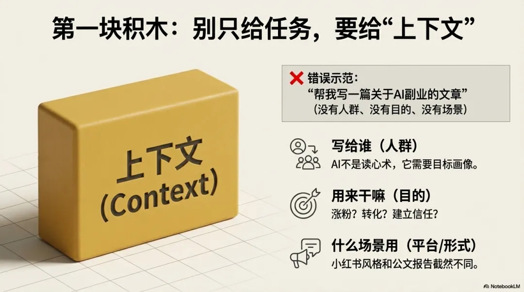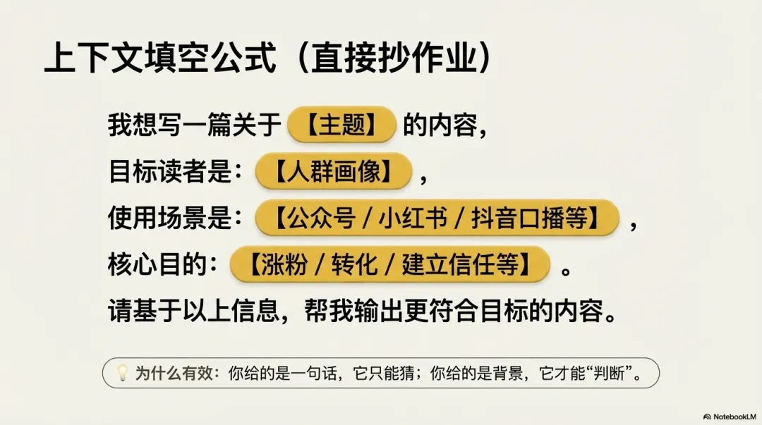你给的是一句话,它只能猜。你给的是背景,它才能“判断”。