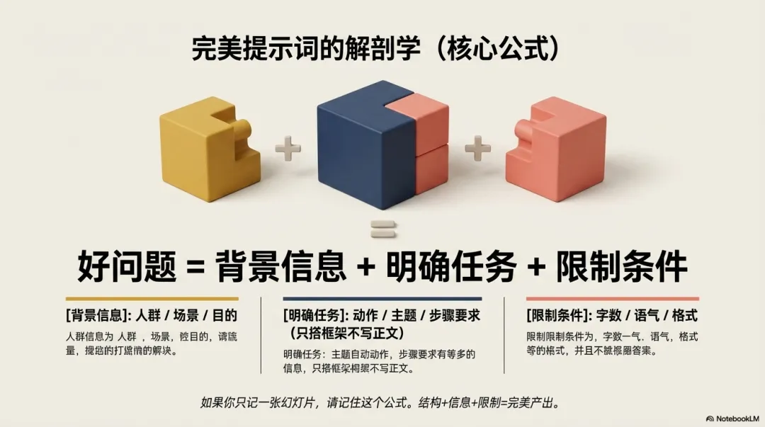 好问题 = 背景信息 + 明确任务 + 限制条件