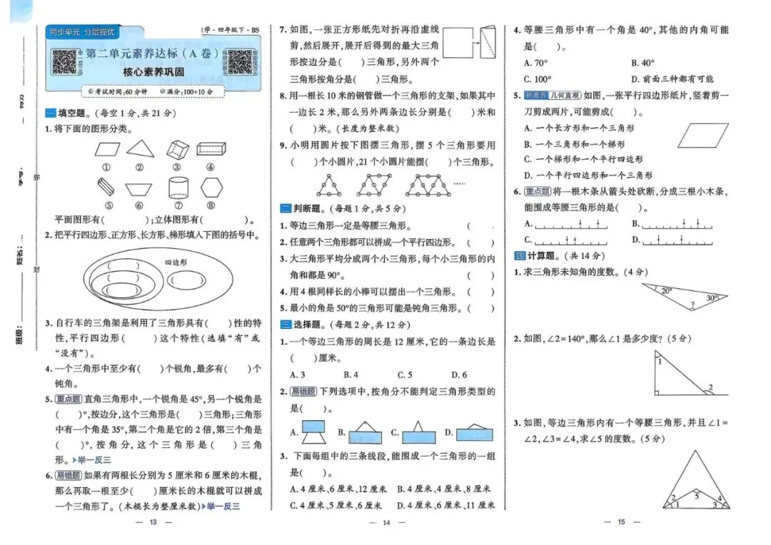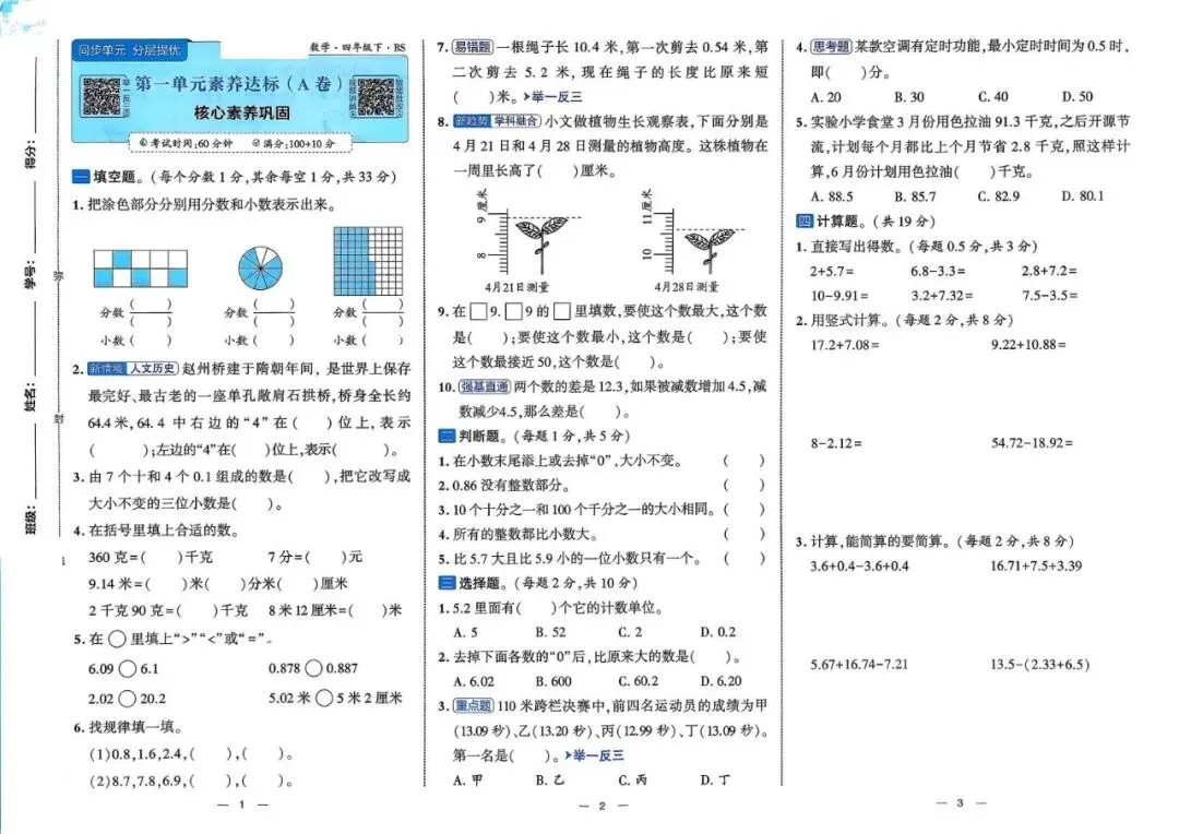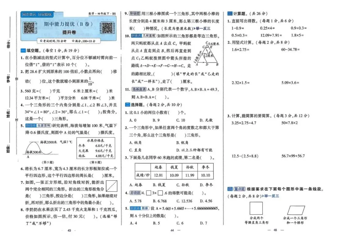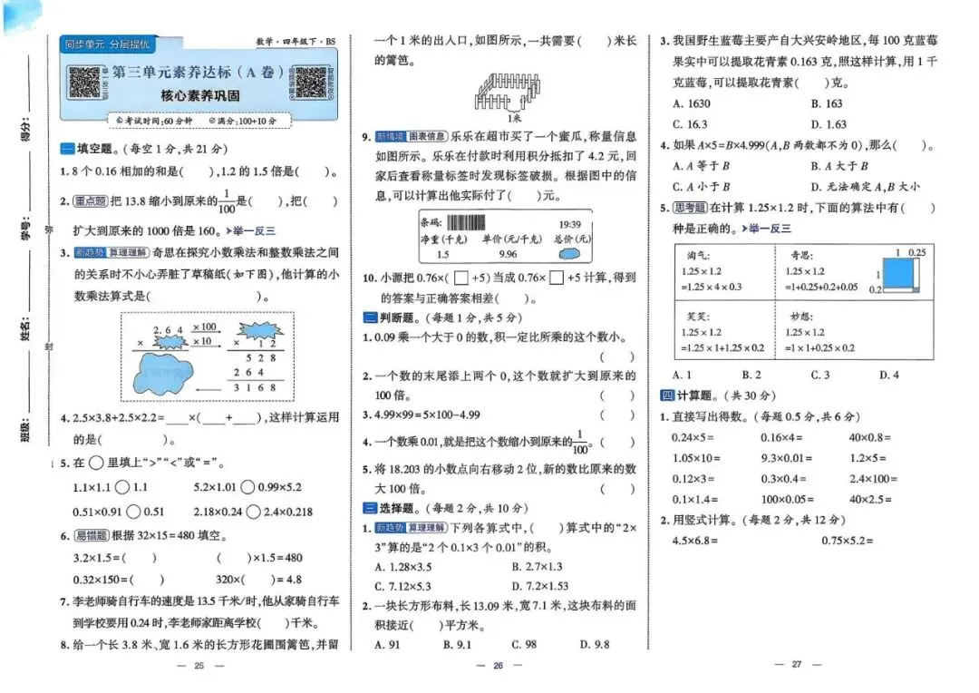 26年春四年级北师大版数学《单元情景卷+期中期末真题卷+专项突破测试卷》,可打印(有答案)