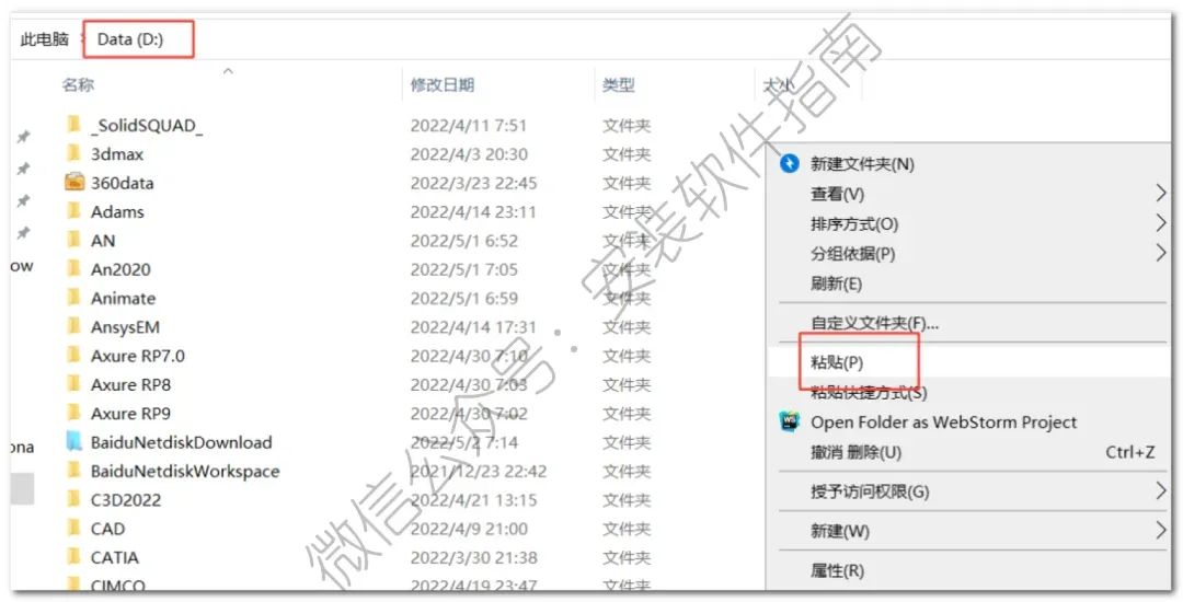 4、打开需要将软件安装的磁盘(如:打开D盘),在空白处鼠标右击选择【粘贴】。
