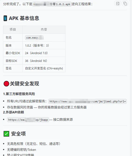 我随手丢给它一个APK文件,它就开始干活了。先检查依赖,然后反编译,接着分析结构。没过多久,整个APP的逻辑就给我还原出来了。最让我惊喜的是,它把APP里所有的API接口都给我提取出来了,Retrofit端点、OkHttp调用、硬编码的URL,一个不落。