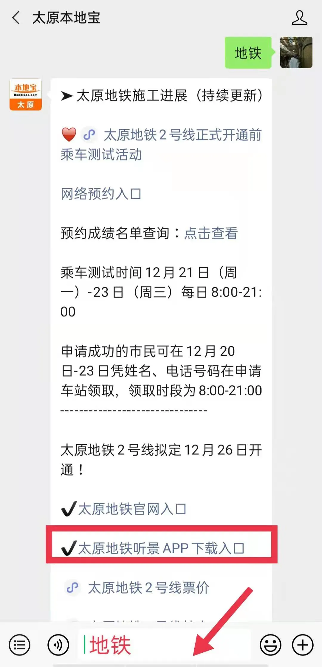 聊天框回复【地铁】获取