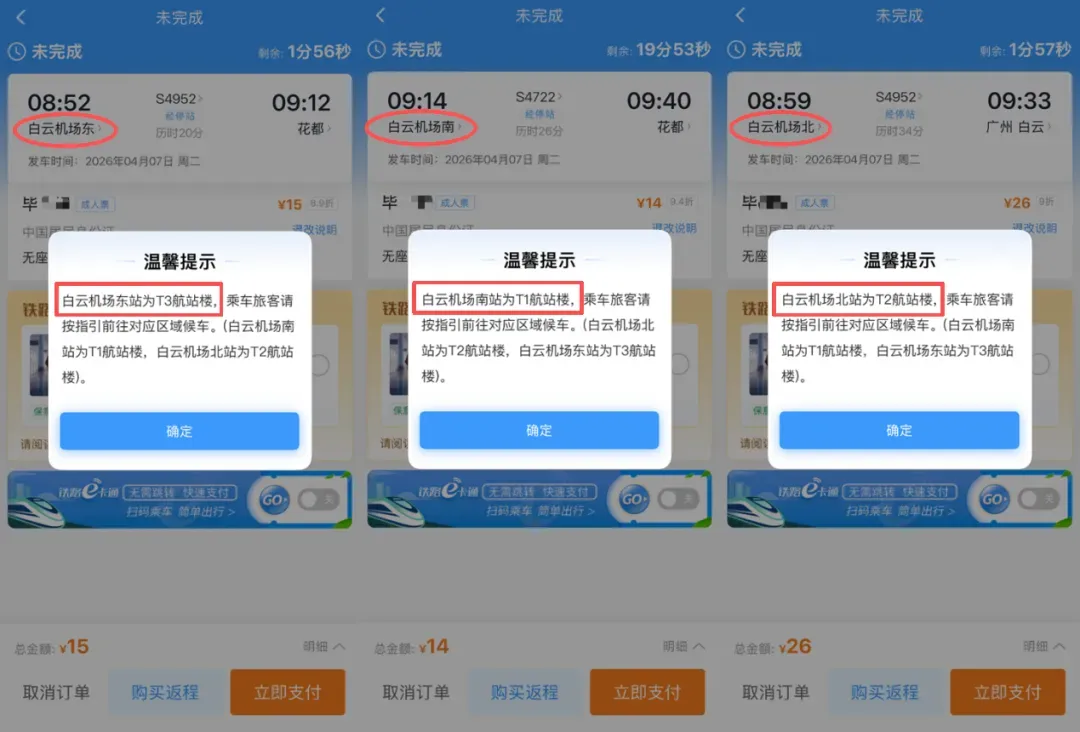 记者了解到,广州地铁还针对白云机场三座城际铁路车站的指引服务进行了优化,为方便旅客辨识白云机场三个航站楼、避免“误乘误下”,在铁路12306系统购票界面上线了提示功能。旅客在购买出发或到达城际白云机场东站(T3)、白云机场南站(T1)、白云机场北站(T2)的车票时,系统将在支付前自动弹出提示框,提醒所对应的具体航站楼信息。