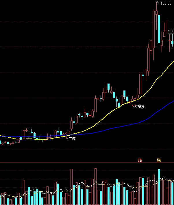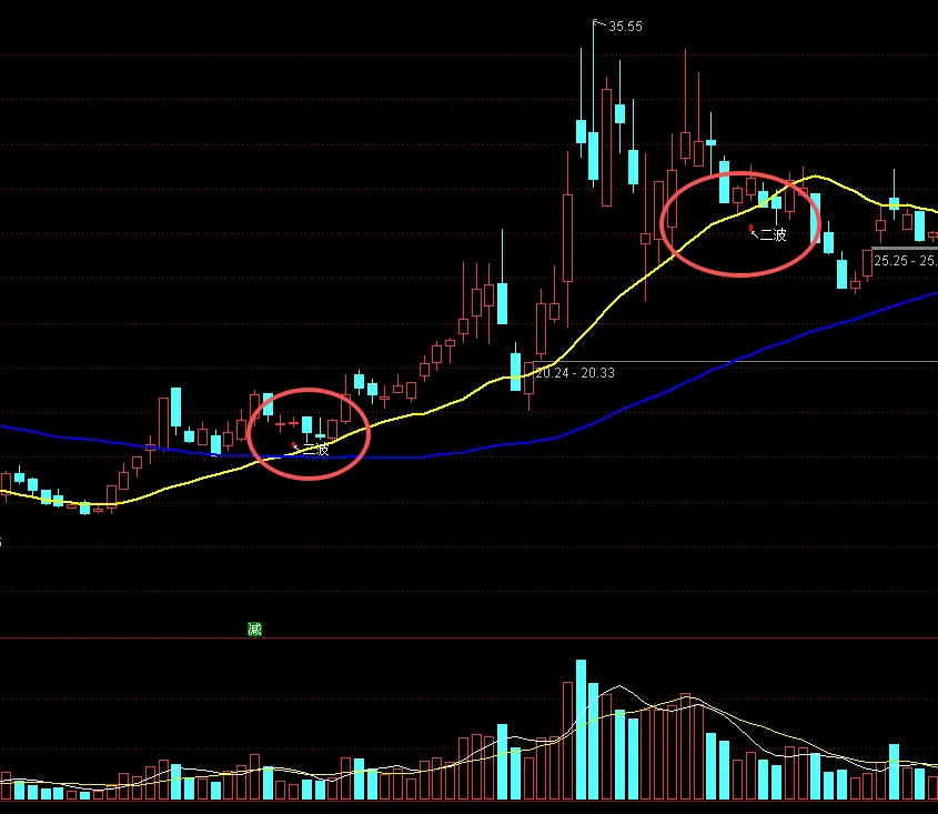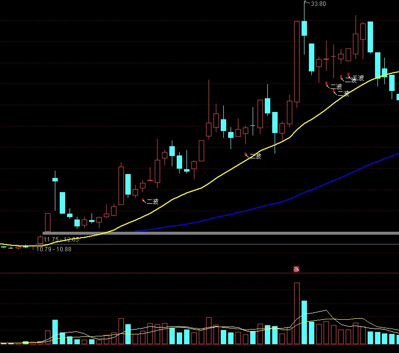 二波实战案例:通达信主图源码:N:=15;{ 1. 基因 – 只保留涨幅要求,去掉纯度和涨停要求 }涨幅:=(HHV(H,N)-LLV(L,N))/LLV(L,N)*100;有主升:=涨幅>=12; { 简化:只有涨幅要求,去掉纯度和涨停 }{ 2. 均线 – 20日线黄色,60日线蓝色并加粗 }MA20:MA(C,20),COLORYELLOW,LINETHICK2;MA60:MA(C,60),COLORBLUE,LINETHICK2;{ 3. 位置 – 调整:回调幅度4%~30% }高:=HHV(H,N);回调:=(高-C)/高*100;好位置:=回调>4 AND 回调<30;{ 4. 洗盘 – 不限制单日跌幅,改为任意阴线洗盘 }洗盘阴:=COUNT(C=1; { 至少有一天下跌即可,不限跌幅 }{ 5. 形态 }阳:=C>O AND C>REF(C,1) AND (C-REF(C,1))/REF(C,1)*100<=5.0;假阳:=C>O AND C<span and=”” abs((c-ref(c,1))=”” ref(c,1)*100)<=>阳线:=(阳 OR 假阳);阴:=C<o and=”” abs((c-ref(c,1))=”” ref(c,1)*100)<=>缩量:=V{ 形态1:连续两根阳线 }形态1:=阳 AND REF(阳线,1) AND REF(缩量,1);{ 形态2:两阳夹一阴,强化条件 }形态2:=阳 AND REF(阴,1) AND REF(阳线,2) AND C>REF(O,1) AND REF(缩量,2);{ 形态3:假阳线+真阳线 }形态3:=阳 AND REF(假阳,1) AND REF(缩量,1);{ 形态4:两阳夹两阴 }形态4:=阳 AND REF(阴,1) AND REF(阴,2) AND REF(阳线,3)AND C>REF(O,1) AND REF(缩量,3);{ 形态5:三阳夹一阴 }形态5:=阳 AND REF(阳线,1) AND REF(阴,2) AND REF(阳线,3)AND C>REF(O,2) AND REF(C,1)<=REF(O,2) AND REF(缩量,3);当前缩量:=缩量 AND REF(缩量,1);止跌:=(形态1 OR 形态2 OR 形态3 OR 形态4 OR 形态5) AND 当前缩量;{ 6. 信号 – 修改基础条件:股价在20日和60日均线之上,去掉均线方向条件 }基础:=有主升 AND C>MA20 AND C>MA60 AND 洗盘阴 AND 好位置;信号:=基础 AND 止跌 AND 阳;距离:=BARSLAST(信号);买点:=信号 AND (距离>=6 OR 距离=0);{ 7. 绘图 – 最小化显示,新增形态标注 }STICKLINE(买点,L*0.962,L*0.952,0.011,0),COLORRED;DRAWTEXT(买点,L*0.946,’↖二波’),COLORWHITE;{ 标注不同形态 }DRAWTEXT(买点 AND 形态4,L*0.94,’两阳夹两阴’),COLORGREEN;DRAWTEXT(买点 AND 形态5,L*0.94,’三阳夹一阴’),COLORCYAN;选股公式源码:N:=15;{ 1. 基因 – 涨幅要求 }涨幅:=(HHV(H,N)-LLV(L,N))/LLV(L,N)*100;有主升:=涨幅>=12;{ 2. 均线 }MA20:=MA(C,20);MA60:=MA(C,60);{ 3. 位置 – 回调幅度4%~30% }高:=HHV(H,N);回调:=(高-C)/高*100;好位置:=回调>4 AND 回调<30;{ 4. 洗盘 – 至少有一根阴线 }洗盘阴:=COUNT(C=1;{ 5. 形态 }阳:=C>O AND C>REF(C,1) AND (C-REF(C,1))/REF(C,1)*100<=5.0;假阳:=C>O AND C<span and=”” abs((c-ref(c,1))=”” ref(c,1)*100)<=>阳线:=(阳 OR 假阳);阴:=C<o and=”” abs((c-ref(c,1))=”” ref(c,1)*100)<=>缩量:=V{ 形态1:连续两根阳线 }形态1:=阳 AND REF(阳线,1) AND REF(缩量,1);{ 形态2:两阳夹一阴 }形态2:=阳 AND REF(阴,1) AND REF(阳线,2) AND C>REF(O,1) AND REF(缩量,2);{ 形态3:假阳线+真阳线 }形态3:=阳 AND REF(假阳,1) AND REF(缩量,1);{ 形态4:两阳夹两阴 }形态4:=阳 AND REF(阴,1) AND REF(阴,2) AND REF(阳线,3)AND C>REF(O,1) AND REF(缩量,3);{ 形态5:三阳夹一阴 }形态5:=阳 AND REF(阳线,1) AND REF(阴,2) AND REF(阳线,3)AND C>REF(O,2) AND REF(C,1)<=REF(O,2) AND REF(缩量,3);当前缩量:=缩量 AND REF(缩量,1);止跌:=(形态1 OR 形态2 OR 形态3 OR 形态4 OR 形态5) AND 当前缩量;{ 6. 信号 }基础:=有主升 AND C>MA20 AND C>MA60 AND 洗盘阴 AND 好位置;信号:=基础 AND 止跌 AND 阳;距离:=BARSLAST(信号);买点:=信号 AND (距离>=6 OR 距离=0);{ 7. 选股输出 }选股:买点;这个版本选出来的比较多,需要手动筛选,看看历史案例失败和成功案例的区别比如下图如果一波走势不够利索,或者位置过高,或者前期多次出现过二波信号那么越往后成功率也就越低需要结合其他技术来综合判断重要声明:仅做知识分享,技术指标仅供参考,不做任何投资依据,据此操作风险自负,股市有风险 投资需谨慎!