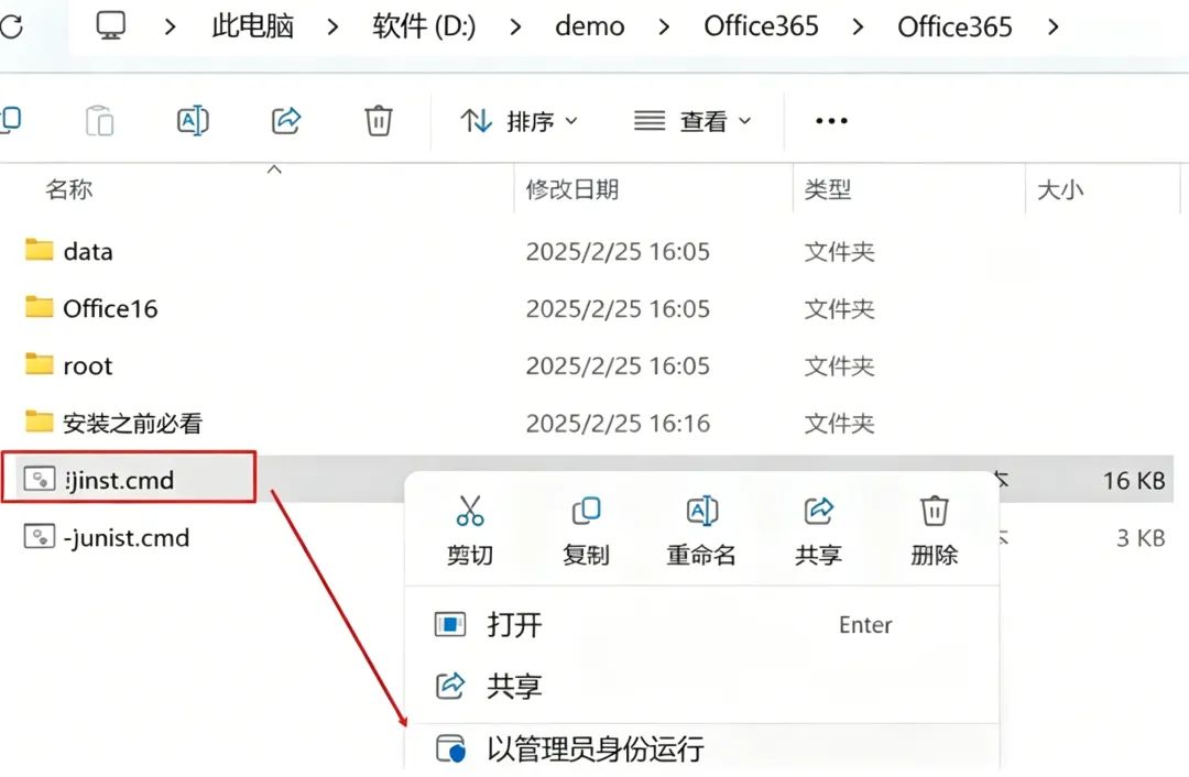 1.将下载好的压缩包解压,然后选中“❗)inst.cmd”鼠标右键以管理员身份运行。