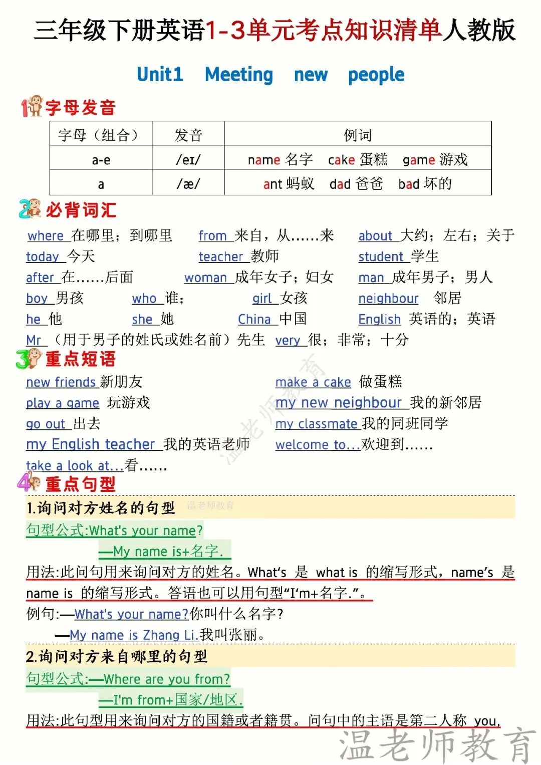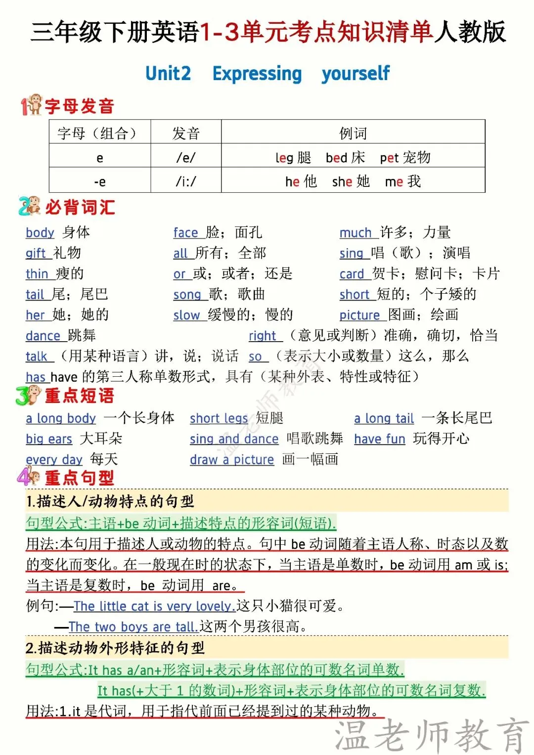 今天分享的是:三年级下册英语人教版期中单元必背知识。这套资料整理汇总了三下英语1-3单元的必背的知识点,包含了每课重点单词、短语等内容,可以作为晨读晚诵材料使用,是非常不错的期中课内复习资料!