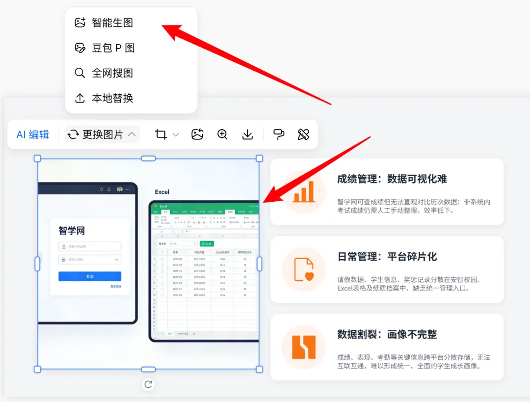 不满意的配图可以让它重新调整,改完效果很不错。修改时还能提具体要求,我要求有智学网和excel样式,效果如图。