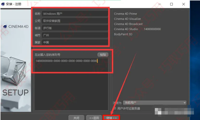 第六步:填写用户信息(可以自定义)输入序列号 点击继续
