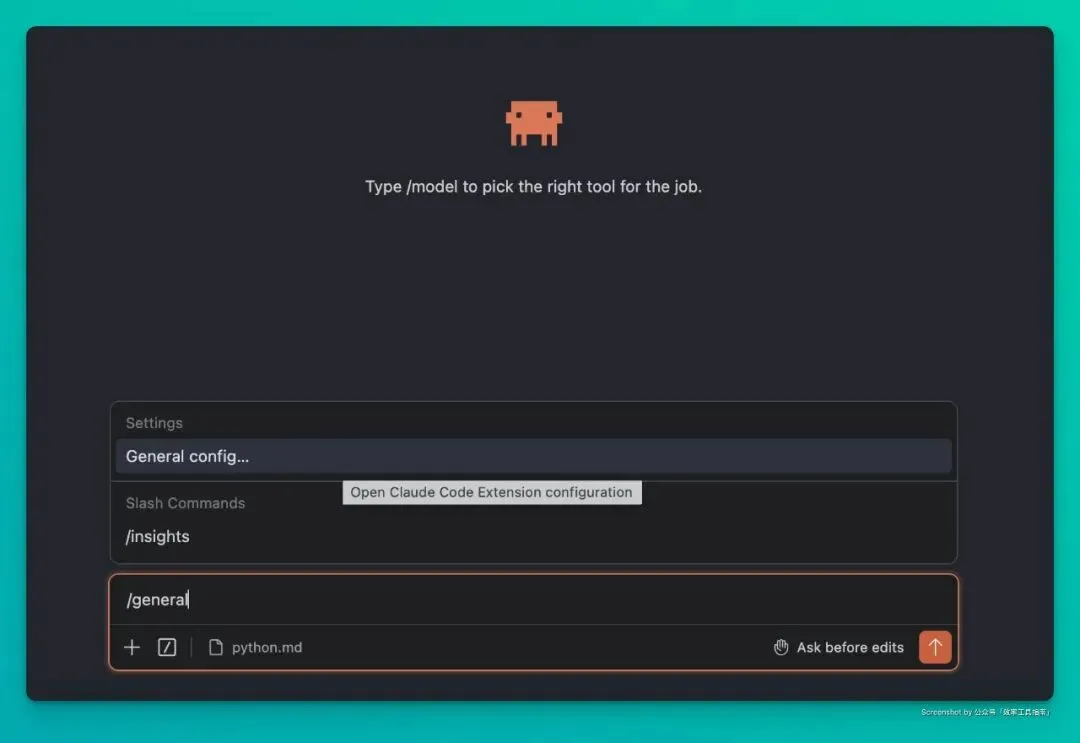 在 Claude Code 对话框输入 /general,点击上方出现的 General config。