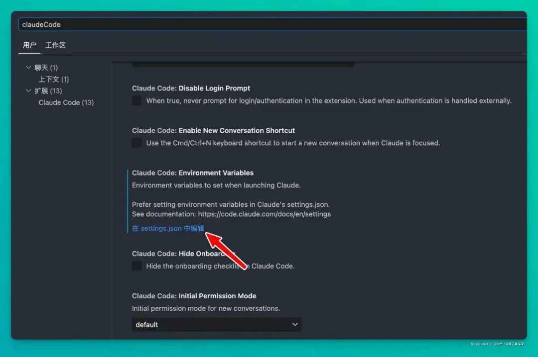 此时会打开下图的设置页面,下滑找到 Claude Code 环境变量,点击下方的蓝色文本「在 settings.json 中编辑」。