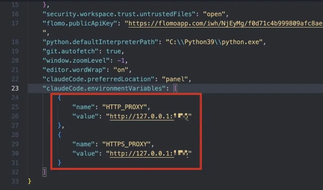 在 json 文件末尾的 Claude Code 环境变量中,依次添加两个对象,对象的 value 值末尾的端口号(即英文冒号后边的 4 位数字)不是统一的,取决于你使用的 proxy 工具。