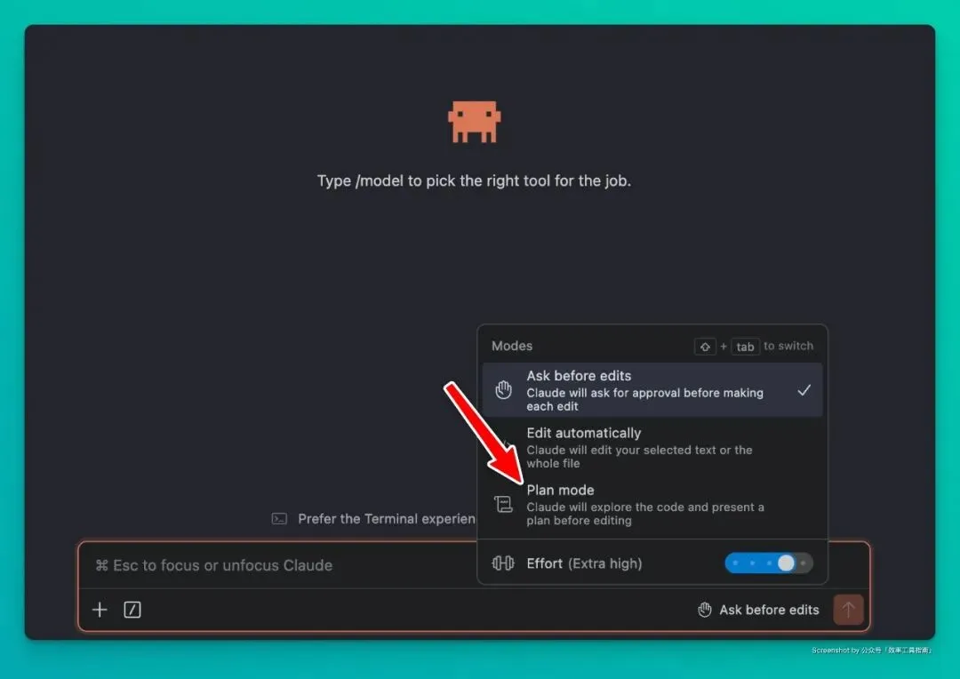 ① 计划模式(Planning Mode):在终端里按两下 Shift + Tab 开启,如果是在 VS Code,点击输入框右下角的「Ask before edits」,在弹出的面板,选择 Plan mode,同样可以启用计划模式。