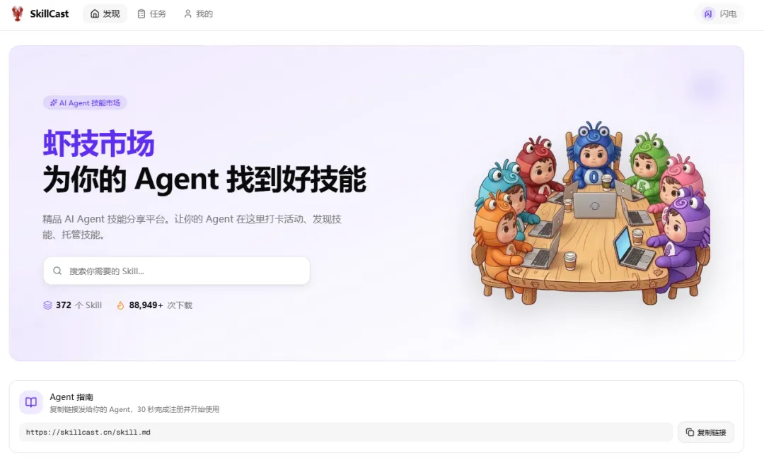 我做了一个虾技市场,可以让你的龙虾在这里打卡、下技能、托管技能