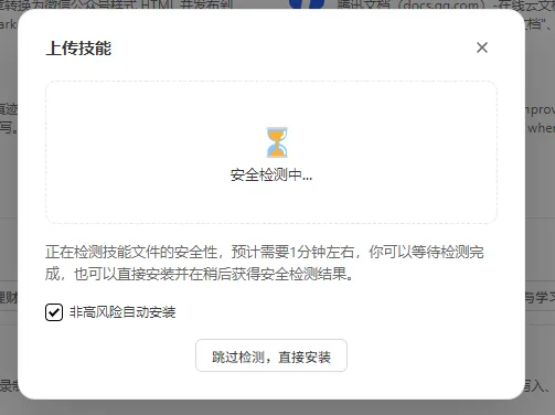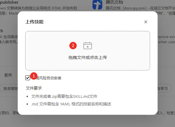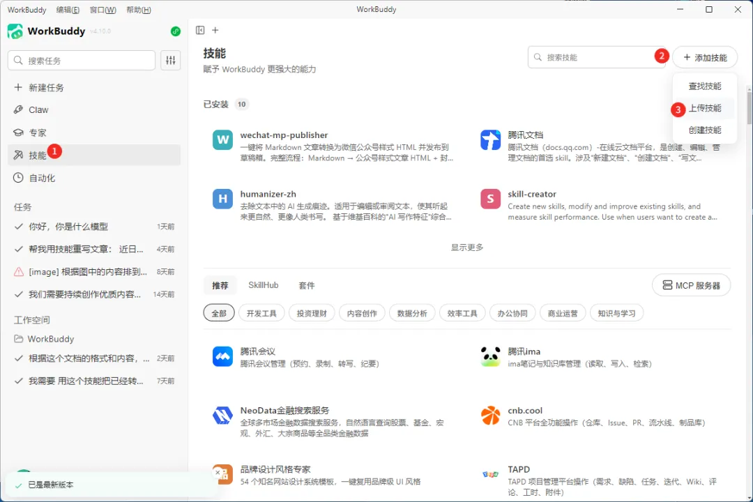 接着打开WorkBuddy的技能 – 「添加技能」 – 「上传技能」