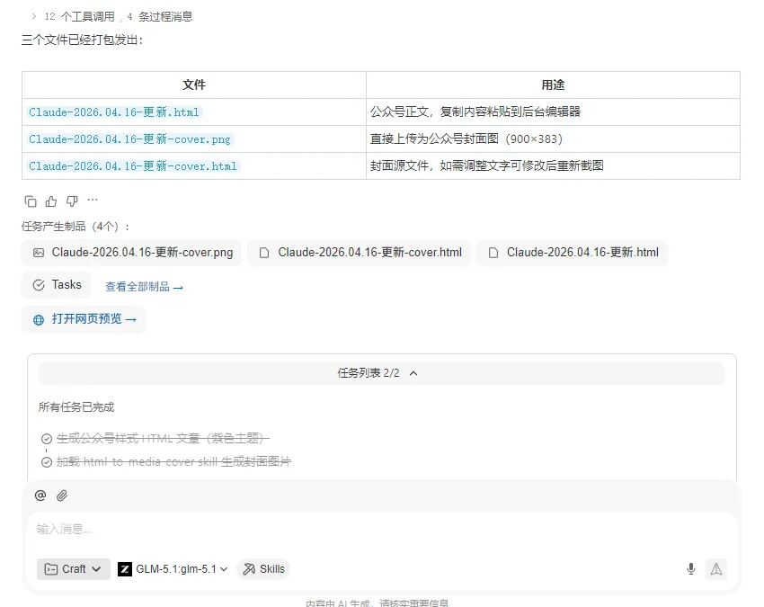 用wechat-mp-styler 帮我把Claude 2026.04.16 更新.md 这篇文章转换成公众号文章,并用html-to-media-cover 生成文章封面图片
