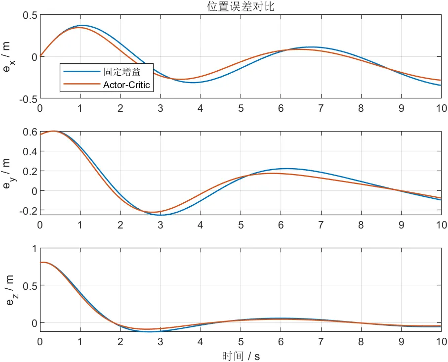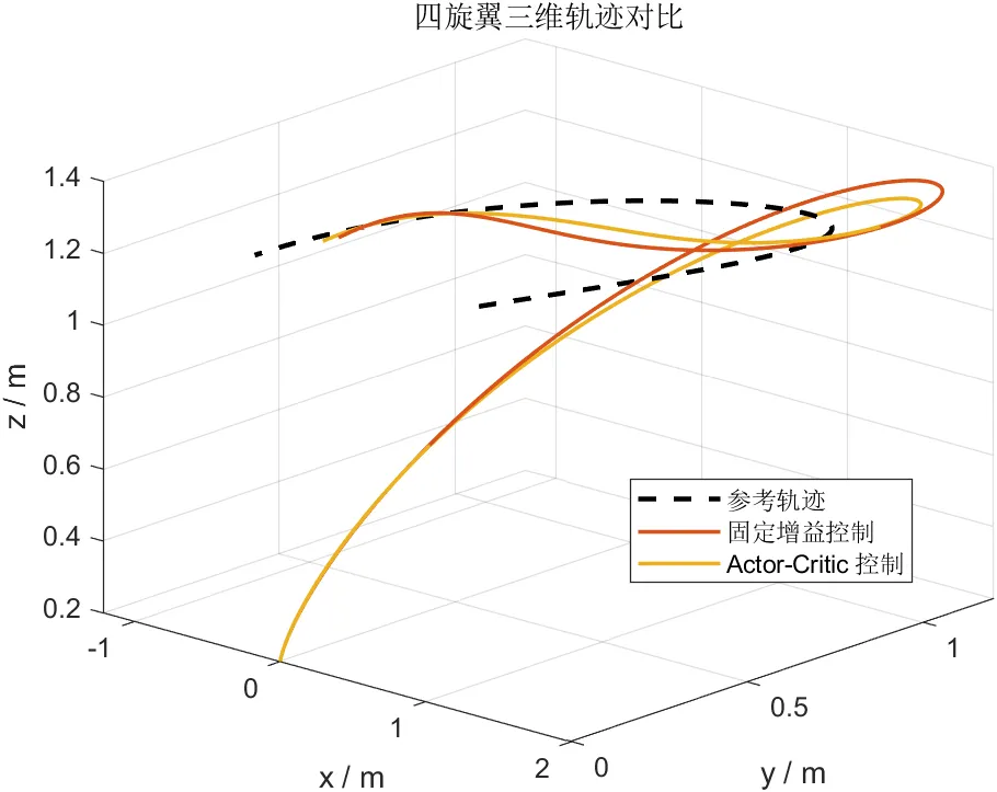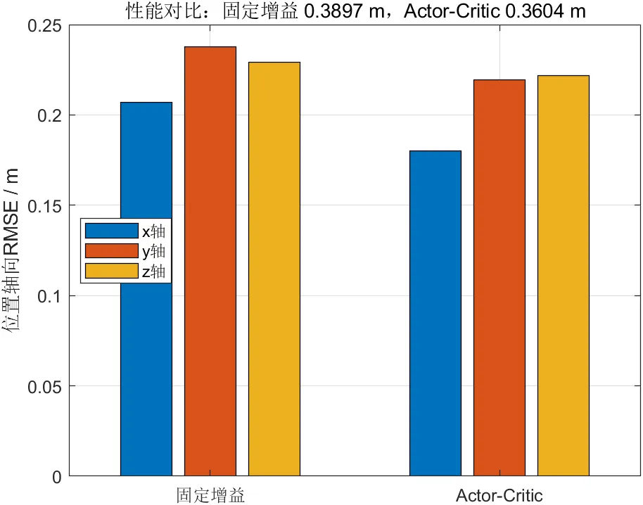 综合性能对比结果表明,Actor-Critic控制器在整体位置均方根误差指标上优于固定增益控制器,说明所提方法在轨迹跟踪精度方面取得了实质改善。更重要的是,这种改善并非通过增加高频控制动作换取,而是在控制输入更平滑、姿态响应更稳定的前提下实现的。因此,本文方法在“性能提升”与“工程可实现性”之间建立了较为合理的平衡。