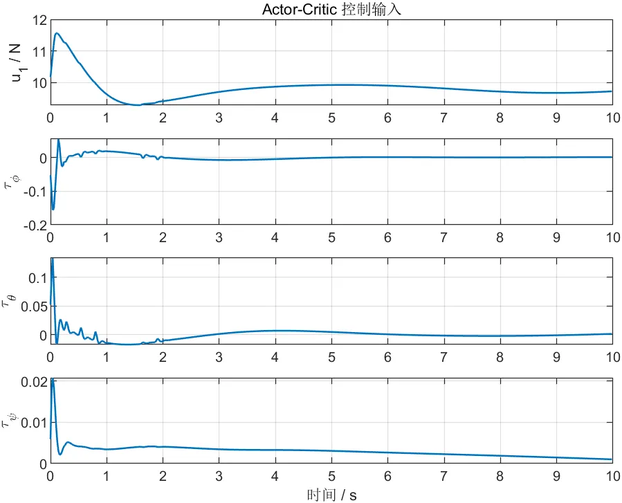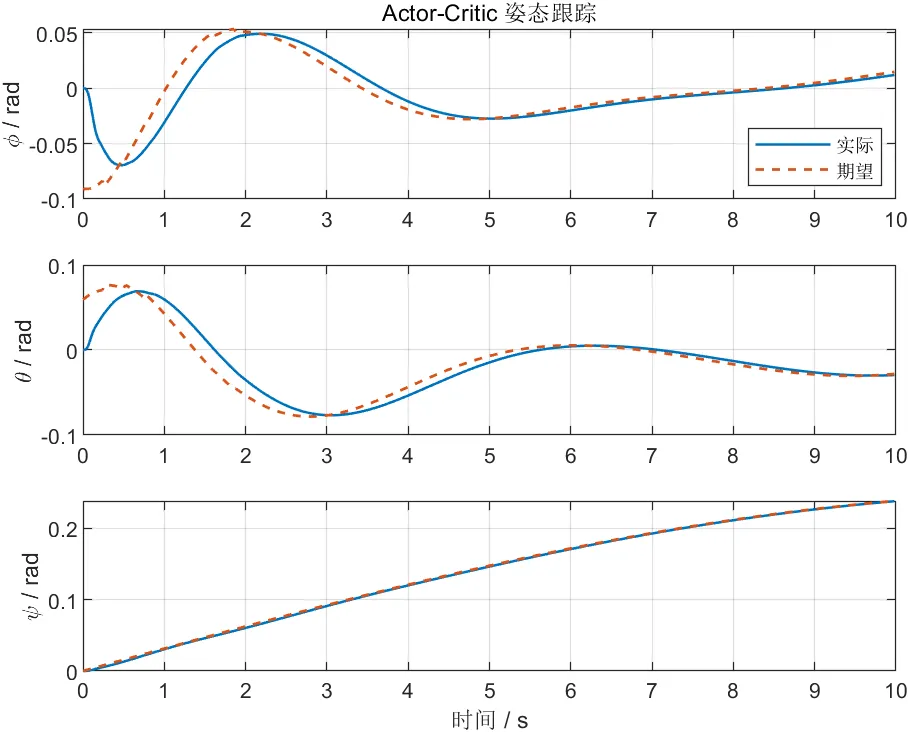 本文在实现上采用位置外环与姿态内环协同设计。位置外环根据参考轨迹与当前飞行状态计算位置误差和速度误差,并生成期望姿态和总推力参考。由于四旋翼在水平运动中需要依靠滚转和俯仰改变推力方向,因此位置误差不仅影响平移通道,也会间接影响姿态参考。对于姿态内环,则根据滚转、俯仰和偏航的期望值与实际值之间的差异,输出相应的姿态力矩指令。整个控制过程中,Actor-Critic策略并不改变双环结构本身,而是对关键增益模式进行选择和调整,使控制器在不同状态下具有更灵活的响应风格。
