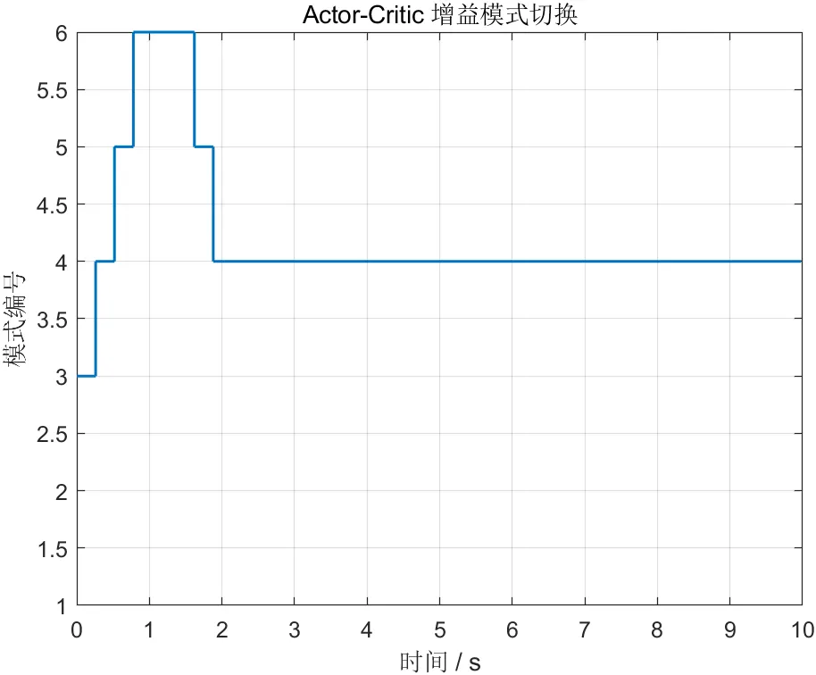 从飞行过程来看,控制任务通常可以分为三个阶段。初始阶段位置误差较大,需要更积极的控制模式以尽快建立接近参考轨迹的运动趋势;中间过渡阶段误差虽已下降,但轨迹曲率变化和姿态耦合更明显,需要在精度与平滑之间取得平衡;稳态跟踪阶段则更强调误差抑制和控制输入平滑。本文方法正是利用Actor-Critic在这些阶段之间进行模式切换。仿真结果表明,策略在前段瞬态阶段会经历有限次模式调整,随后逐步收敛至更适合稳态运行的模式,这说明学习器确实承担了高层控制风格调度功能,而不是退化为完全随机切换或完全静态选择。