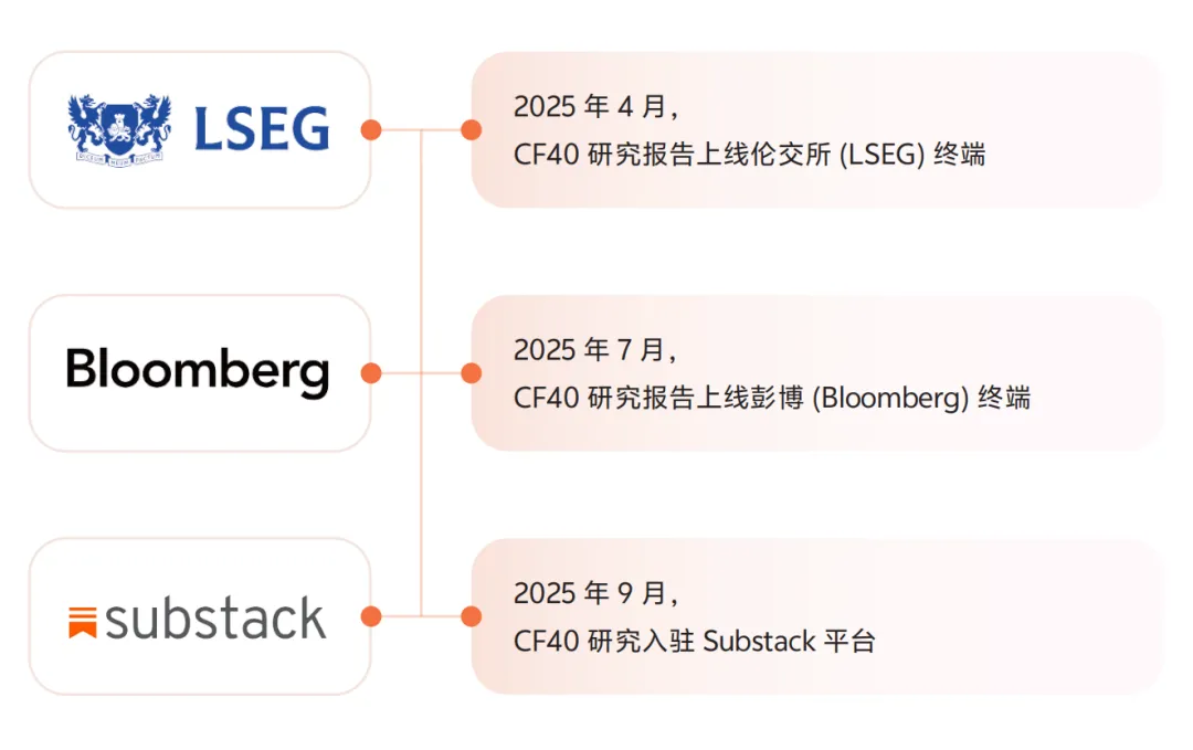 2025年,“CF40研究”着力推动研究成果的全球触达,入驻Substack平台,并登陆彭博(Bloomberg)及伦敦证券交易所(LSEG)终端,显著提升了研究成果在国际范围的可及性。