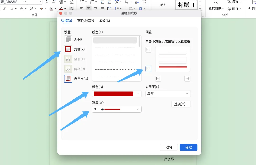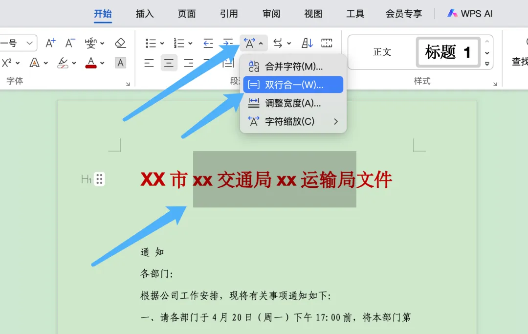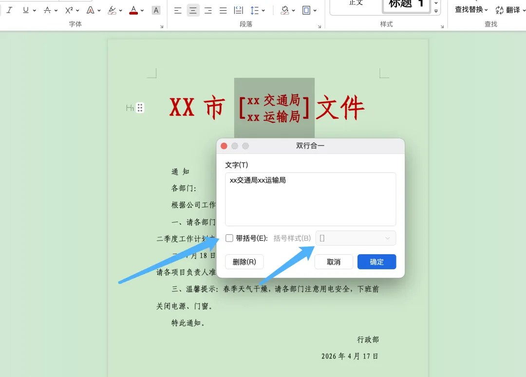 WPS文稿怎样制作红头文件? 本期分享红头文件的制作方法,需要用到的是文稿里的双行合一,以及边框底纹设置⬇️ 首先我们输入文字、设置颜色、字体字号、居中⬇️ 然后选中需要双行合一的文字,在开始选项卡下选择中文板式,选择双行合一⬇️ 接下来我们可以自己设置是否需要带括号,以及括号的样式⬇️ 大家可以根据自己的需要即可,我们在选中文字,点击开始选项卡下的边框,选择边框和底纹⬇️ 设置方框,颜色、宽度为3磅,在预览位置只选择下边框,把其他三面都取消就完成了⬇️ 点击最上方蓝字她与玫瑰茶 加个关注,我们一起进步~