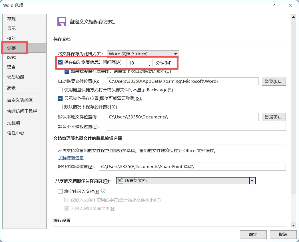 使用Word的【文件-选项-保存-保存自动回复时间间隔-5/10分钟】功能可自动定时保存文档,避免意外导致内容丢失,为文件提供双重保险。