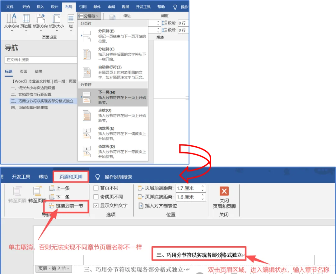 用【布局-分隔符-下一页分节符】,断开各节页眉页脚链接,单独设置每一节格式,实现封面、摘要无页眉,正文奇偶页不同页眉。